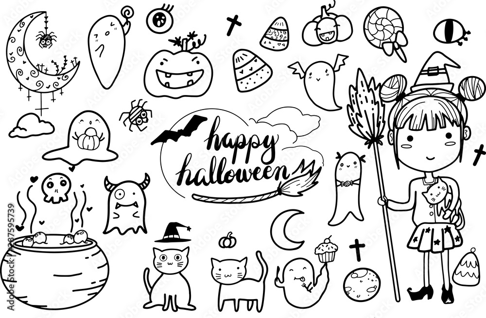 Vector Doodle Set Of Halloween Clipart A Funny Hand Draw Cute Illustration For Seasonal Design Textiles Decoration Of A Children S Playroom Or A Greeting Card Pumpkins Ghosts Witch Hats Etc 11709247 Vector